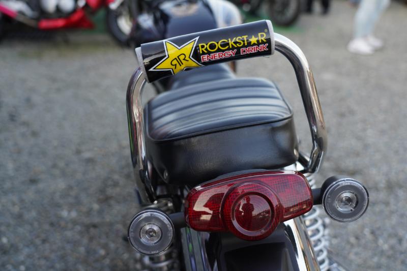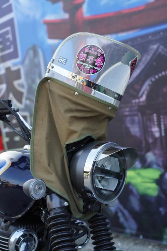 こちらのGB350は前倒しの短風防を装着したイカツいスタイル。ライトにはピヨピヨも取り付けられていて、族車感を醸し出している。スクリーンの裏側には全日本麗心愚連盟のステッカーが貼ってあったりするのも興味深い。