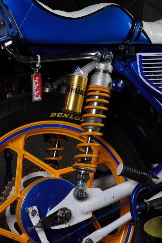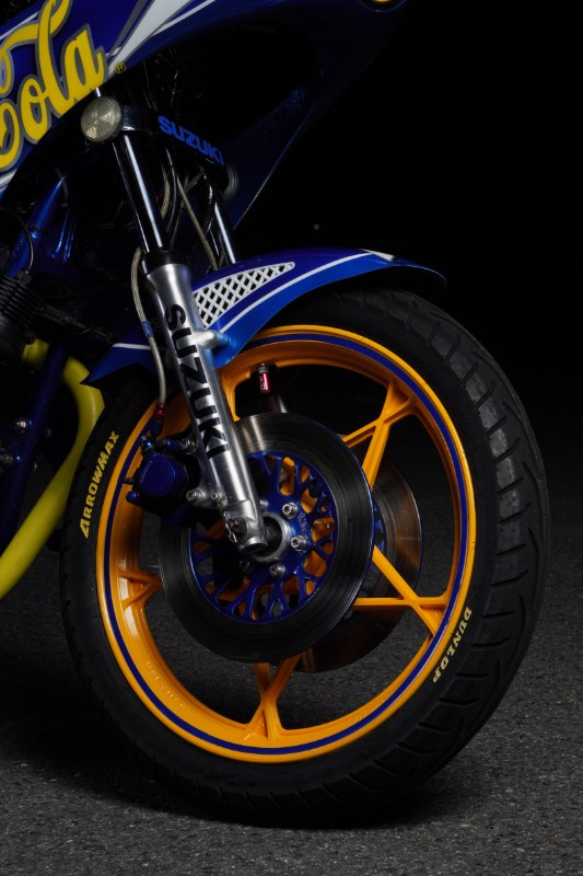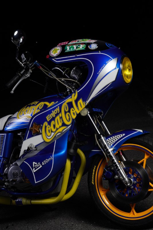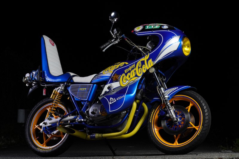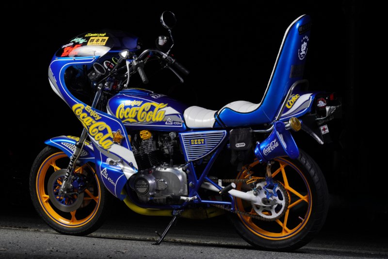 そしてこのGS400は、オーナー氏が目指したコンセプトである「青コーラ」で彩られている。青地に黄色のロゴという、オリジナルとはまた違った爽やかさと奇抜さがユニークな印象を放っている。ボアアップしていることを暗喩している“450ml”の表記も面白い。星型キャストホイールとダブルディスク化したフロント周りも注目ポイントだ。