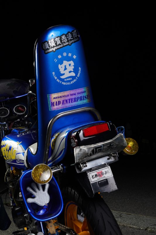 三段シートもメタリックブルーでボディカラーと馴染ませている。リアビューに目を移せば、コミカルな拡声器とクラシカルなウィンカー、チーム名などのステッカーが絶妙に共存し、昔ながらの“お約束”を守りつつも遊び心を忘れていないことが分かる。