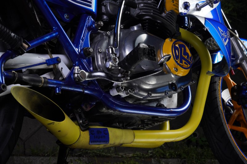 マフラーはチャンプサイクロン音頭。GSらしい野太い低音を響かせるマフラーを、あえて鮮やかなイエローにすることで重苦しさを消し、むしろ爽やかでポップな印象すら与えている。
