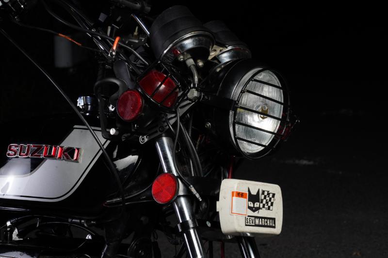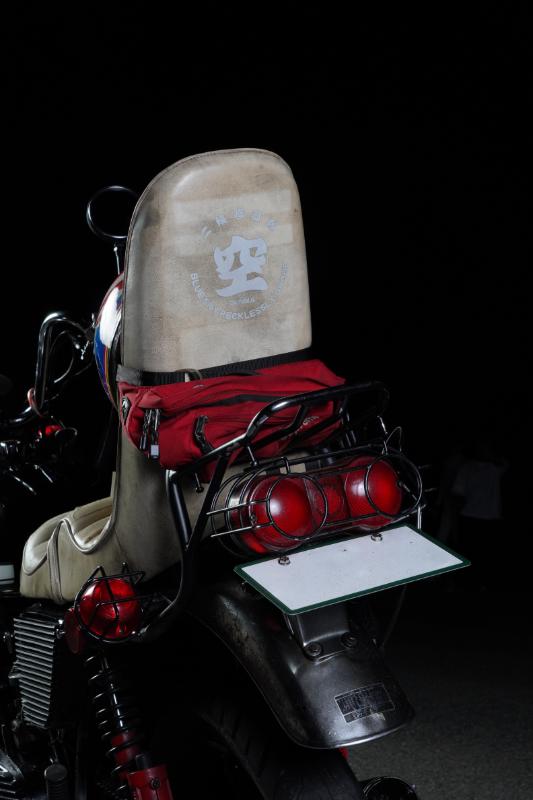 リアの灯火類もライトガードで固めていて、テールカウル代わりのリアキャリアとともにサンパチならではのカスタム手法を演出。年季の入ったテクスチャーの3段シートに括り付けられたウエストバッグもいい味を出している。