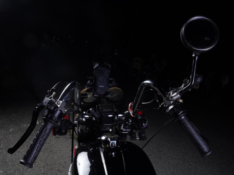 まずフロント周りを見ると、パトランプを彷彿させる真っ赤なウインカー&反射板とデベソのマーシャル、そしてそれらを守るマットブラックのライトガードがなんともイカツい。