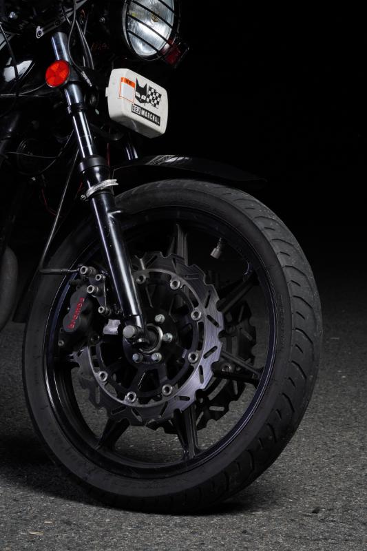 ホイールはセブンスターキャストに換装して精悍さをアップ。加えてブレーキもブレンボのキャリパー&ダブルのフローティングディスクにすることで走りへの真摯な姿勢が感じられる。ペタルローターの無骨さも"漢らしさ”をアップしててグッド。