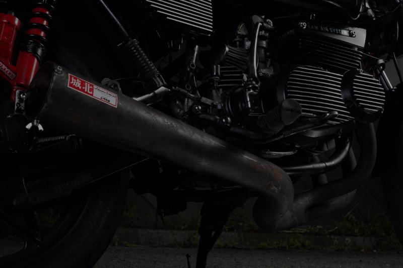 エアクリーナーボックスはパワーフィルターに交換されていて、マフラーはサンパチ乗りに人気の城北ムラカミ管をセット。そもそも甲高いサンパチのエキゾーストだが、この構成だけ見ても、爆音&爆圧になっているだろうことは想像に難くない。