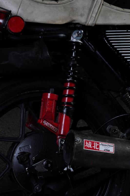 リアサスは安定安心のマルゾッキ、スイングアーム&トルクロッドはウエダレーシング製に換装済み。リアブレーキについては、オーナー氏によるとトリプルディスク化を進めているとのこと。それが実現すればリアタイヤ周りの印象がガラッと変わりそうだ。