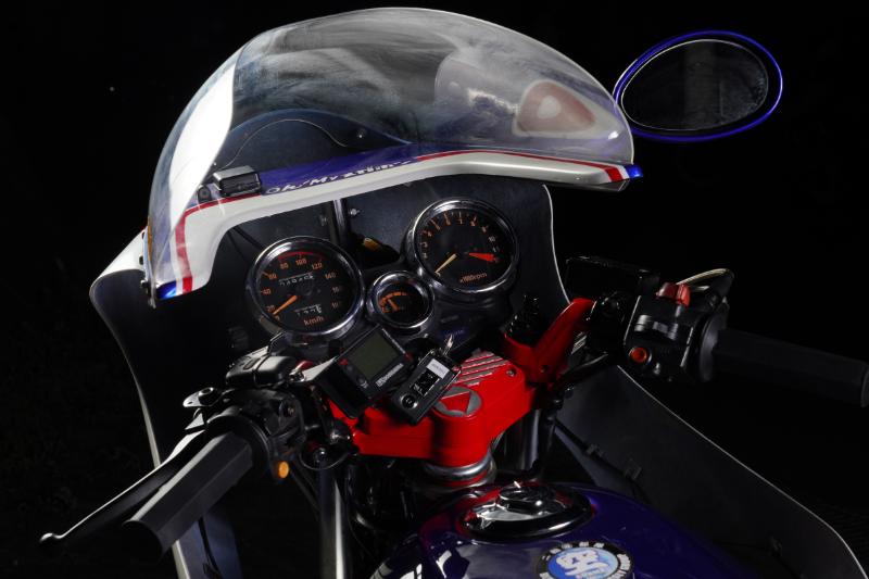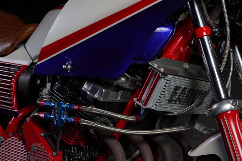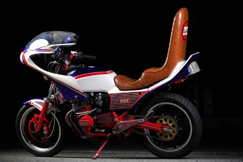 赤・白・青のトリコロールはCBX400Fの純正カラーとしても有名だが、ホンダのレースDNAを象徴する配色でもある。