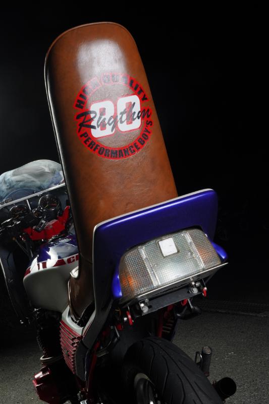 グッとケツ上げされた背面ににそびえる三段シートは、高級感のあるキャメルのレザー模様にロゴがあしらわれ、族車らしい誇示性と個性を押し出している。
