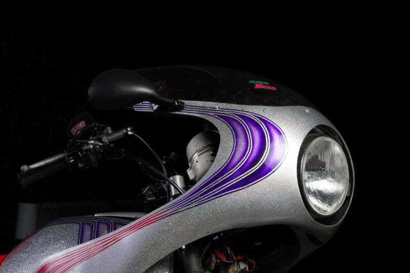 そしてその上を走る赤と紫のグラデーションを施した三本巻きは、フルカウルとタンク、フェンダーにかけての配色のバランスもよく、少ない色数で個性的なスタイルを確立している。ナイツーでは走る姿そのものが“ショーアップ”されるに違いない。