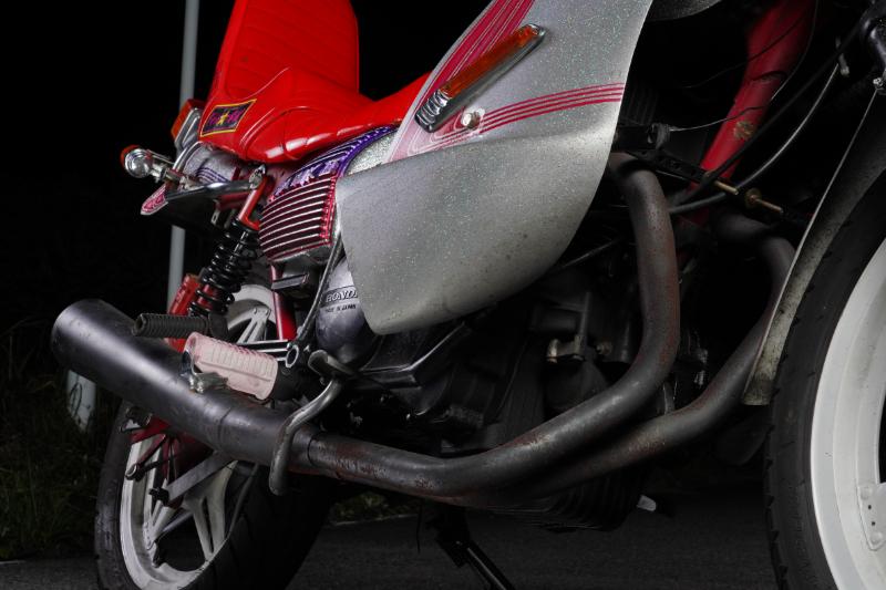 フロントはコムスター×シングルディスク構成。フェンダーにはボディと同じく繊細な三本巻きが入る。サスペンションには定番のマルゾッキをセットし、後輪荷重への十分な対策を確保。リアブレーキのドラムケースとスイングアームを赤にペイントしているのもなかなかニクい。