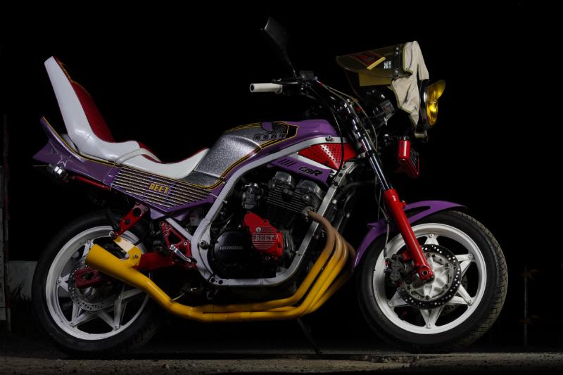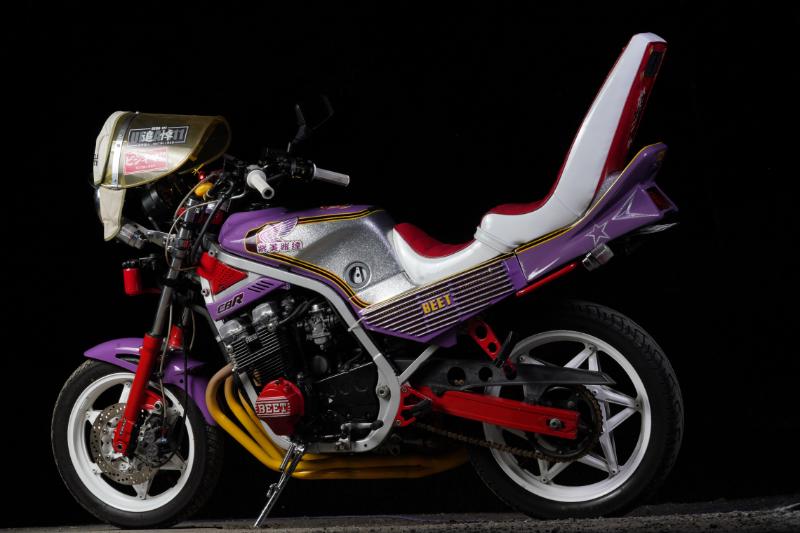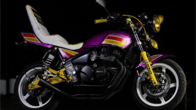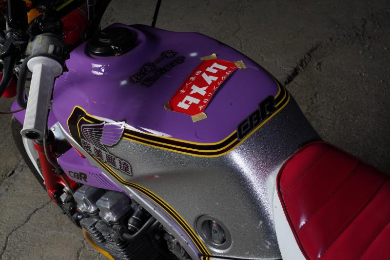 タンクからサイドカバー、シートカウルに連なるパーツの外装カラーは銀ラメとソリッドな紫のツートンカラー。この2色を区分けしているラインは黒地に黄色の縁どりを付けたもので、全体的なデザインとしてはCBX400FのⅡ型をイメージしたものだろう。カラーバランスも程よく、スタイリッシュなセンスを感じさせる。