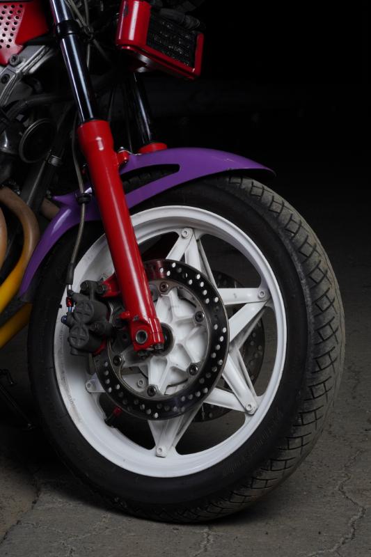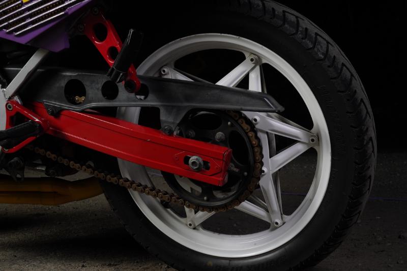 足回りはボトムケースを赤、リムとホイールは白で塗装。フェンダーは本体と同じ紫で、足回りだけでも3色を使っている。