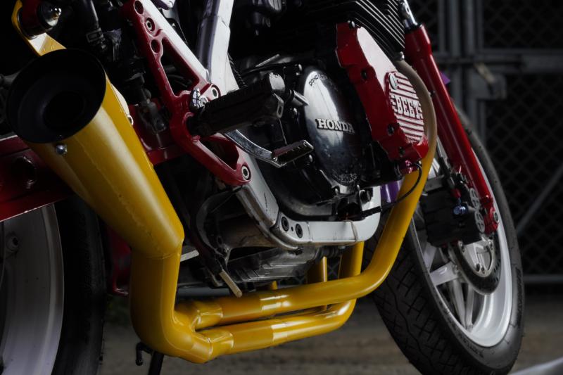 マフラーは耐熱塗装を施したヤシメガ3を装着。爆音コールマシンでもあるCBR400Fにコールマン御用達のヤシメガ管は性能はもちろん見栄えもよく、この黄色の塗装が映える。