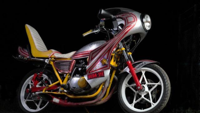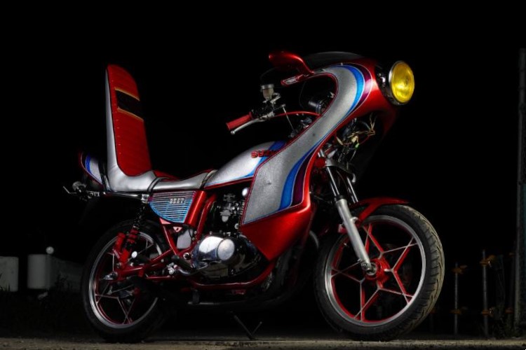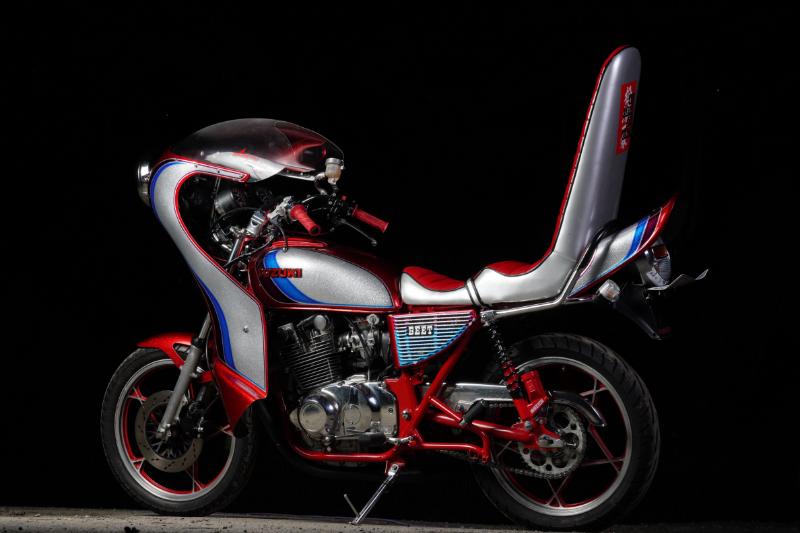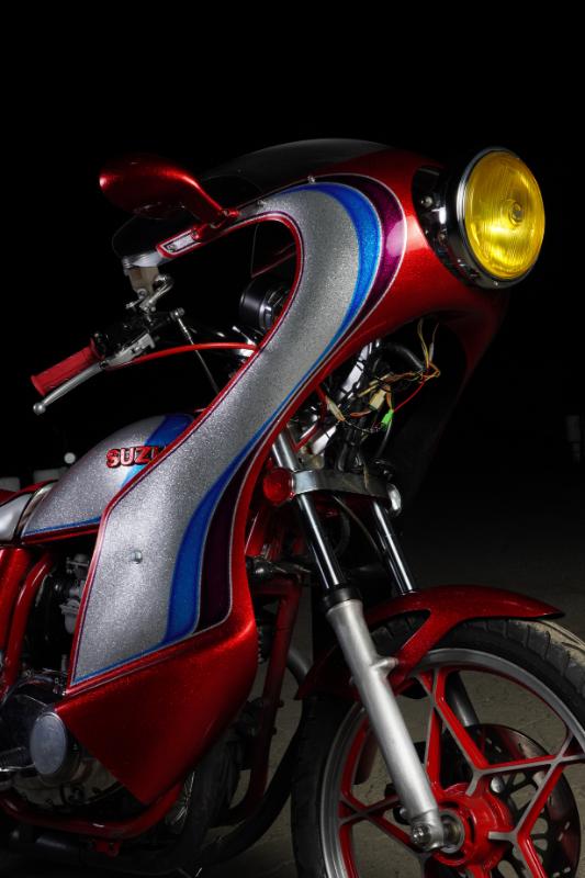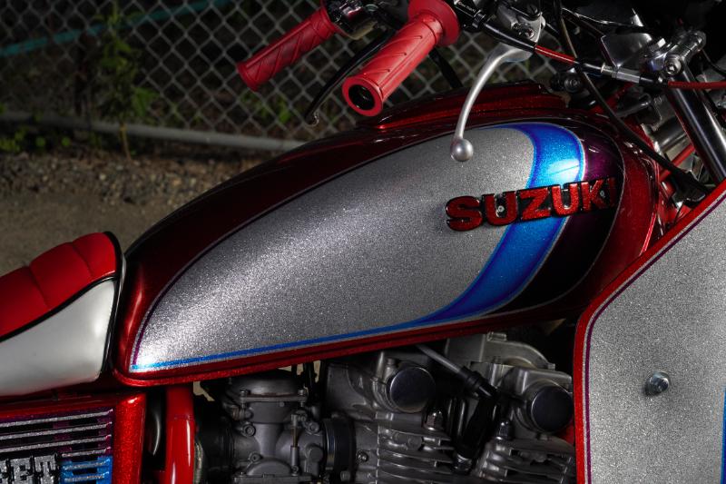 GS外装を載せている時点で大改造だが、その外装も美しく、銀ラメとキャンディーレッドのツートンのあいだに2本のラインを加えた、いわゆる「のの字」外装になっている点も見逃せない。SUZUKIのロゴも残っていて、こちらも表面をキャンディーレッドで塗装している。