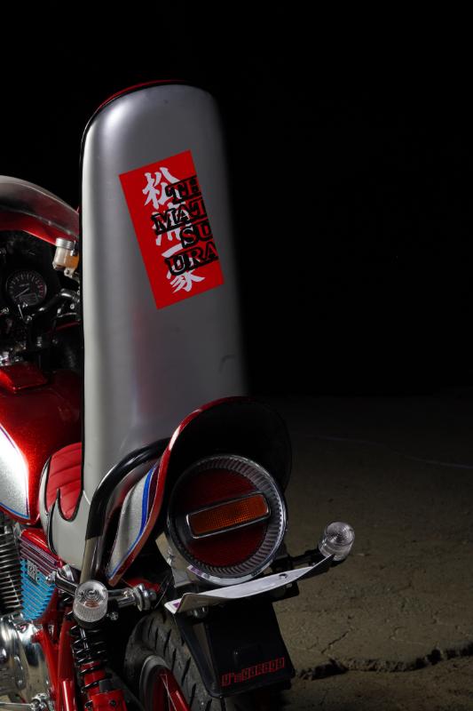 約60センチ延長の三段シートは座面が赤、側面と背面がシルバーというツートンカラー。銀ラメに合わせて使用したシルバーをシートに用いているのは珍しい。テールはZ2テールにチェリーテールを組み合わせてセットするという、ワルい仕様だ。