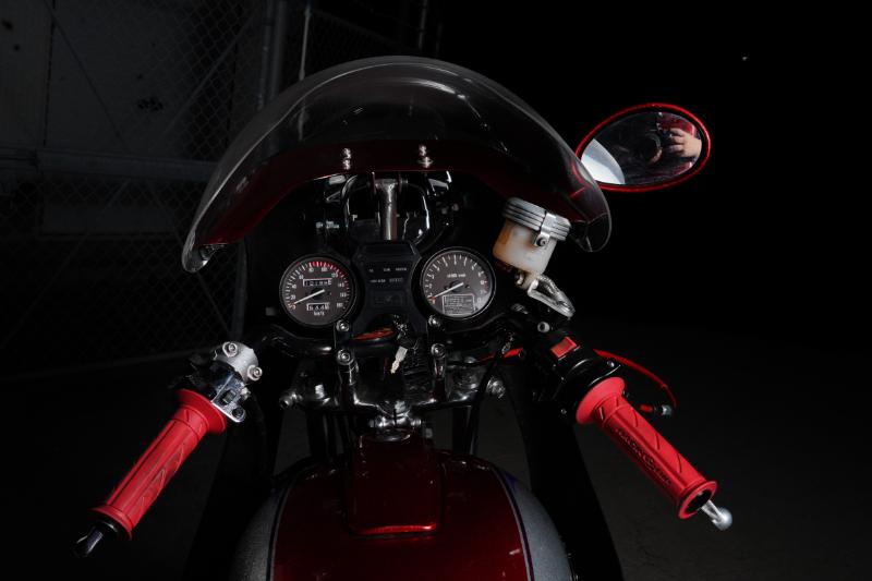 メーターパネルはGSX400L、いわゆる“アメザリ”のメーターを換装。メーターパネルはリビルドされているのか、新品並みの奇麗さだ。