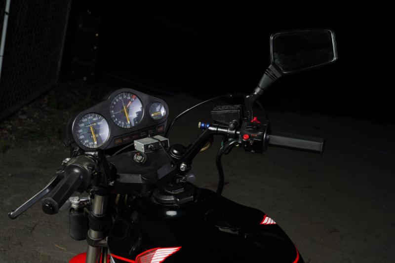 ハンドルはCB750ハンに換装してCBXのスイッチボックスを装備。操作性、特にアクセルワークの向上を意識した仕様で、ワンズアンドエムの軽スロもしっかり装着。さらにレブコンのスイッチも付けて、REVのオン/オフもコントロールしている。
