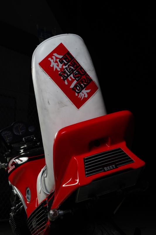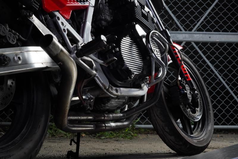 外装はCBRのⅡ型だが、純正とはパターンが逆。黒部分が赤で、赤部分が黒というパターンになっている。CBXなら色のパターンも多くないのでそれなりに知られているが、CBRはⅠ型・Ⅱ型に加えてエンデュランスやF-3など意外と車種が豊富なため、CBR一筋の方でないと正確には覚えていないのではないだろうか。