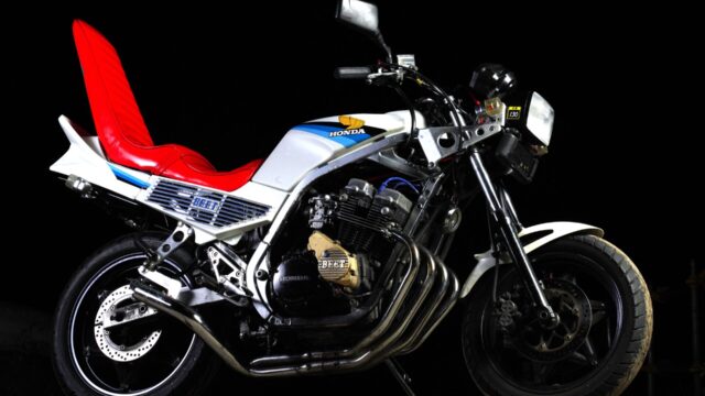 特に純正サイドカバーは印象的で、より広い範囲をカバーする形状が特徴。テールカウルと直線的につながるため、BEETのアルフィンに換装されることが多いパーツだが、ここでは純正らしさを残すカスタムペイントで新鮮な印象を与えている。