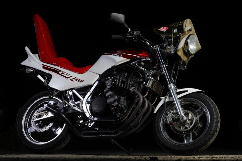 こちらもCBR400Fだが、過去に紹介したどのCBR400Fとも異なるタイプのカスタムが施されている。特徴的なのは外装で、Ⅱ型ラインをベースにサイドカバーも純正仕様。ロゴやラインを残しつつⅡ型ラインを用いたカスタムペイントを施している点だ。