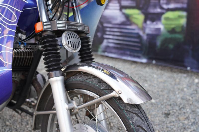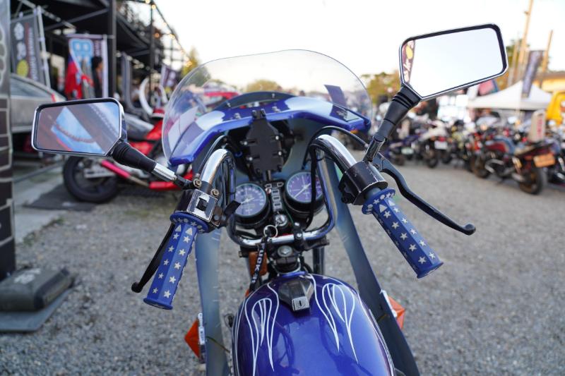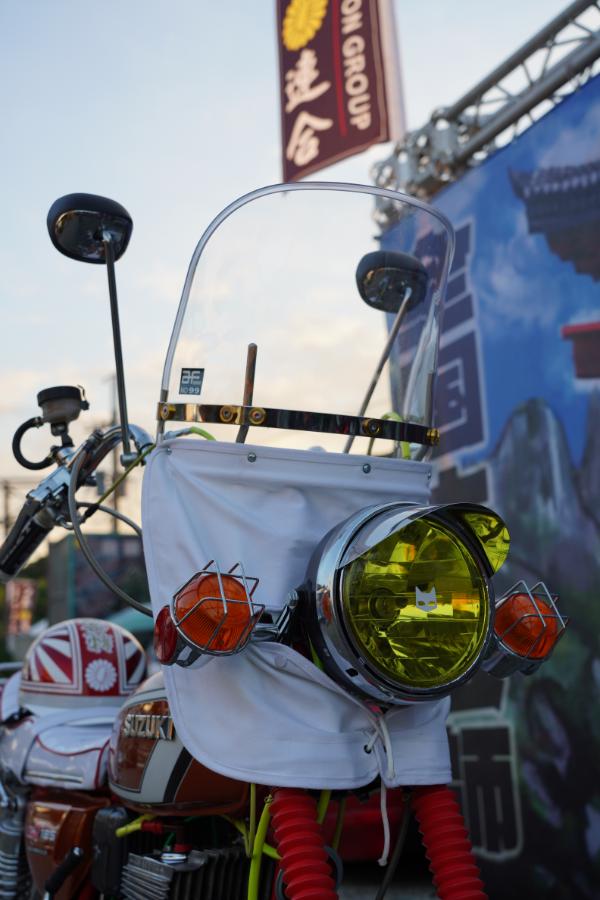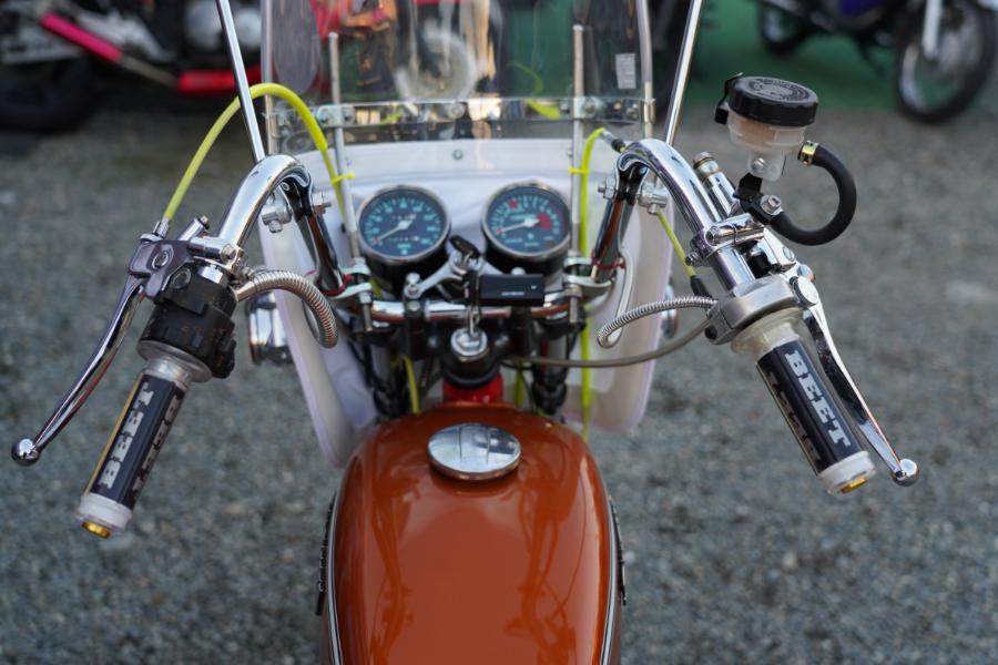 ヘッドライトはピヨピヨ付きのマーシャルのフォグ。ウインカーにはレンズガードを装着し、スクリーンをわずかに前傾させた風防はオフホワイトの垂れを合わせた。このフロント周りだけでもかなり旧車會然としたルックスを手に入れているといえる。