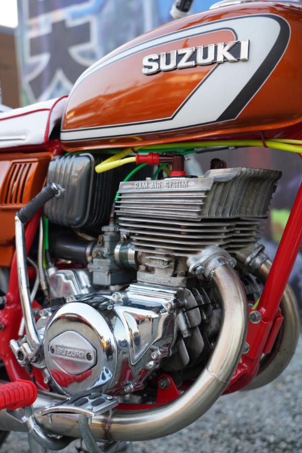 エンジンの形状も独特。まず2気筒というサンパチとの大きな違いはあるが、ラムエアシステムの形状が絶妙にサンパチとは異なっている。GTの185㏄という車両は滅多にお目にかかるものではないので、ある意味、希少なショットだともいえる。